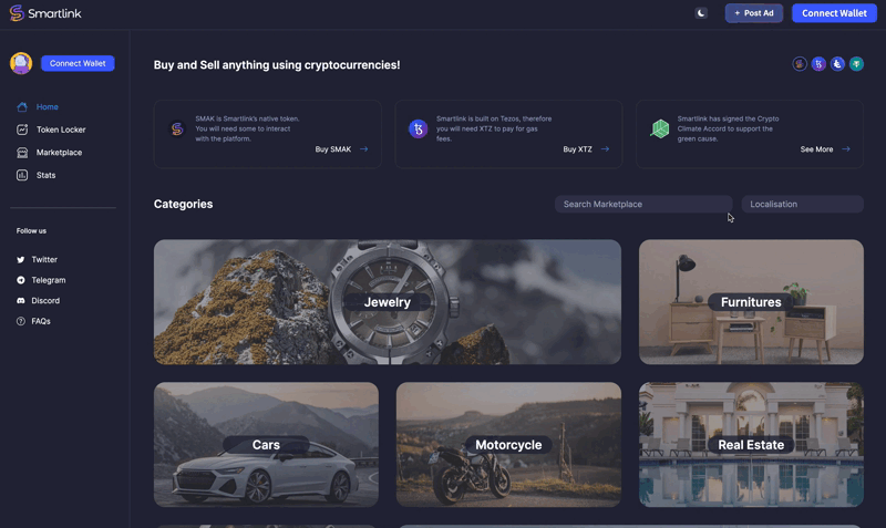 Connect your Tezos wallet to the Smartlink App using the ‘Connect Wallet’ button at the top-right hand of the screen.&#x20;